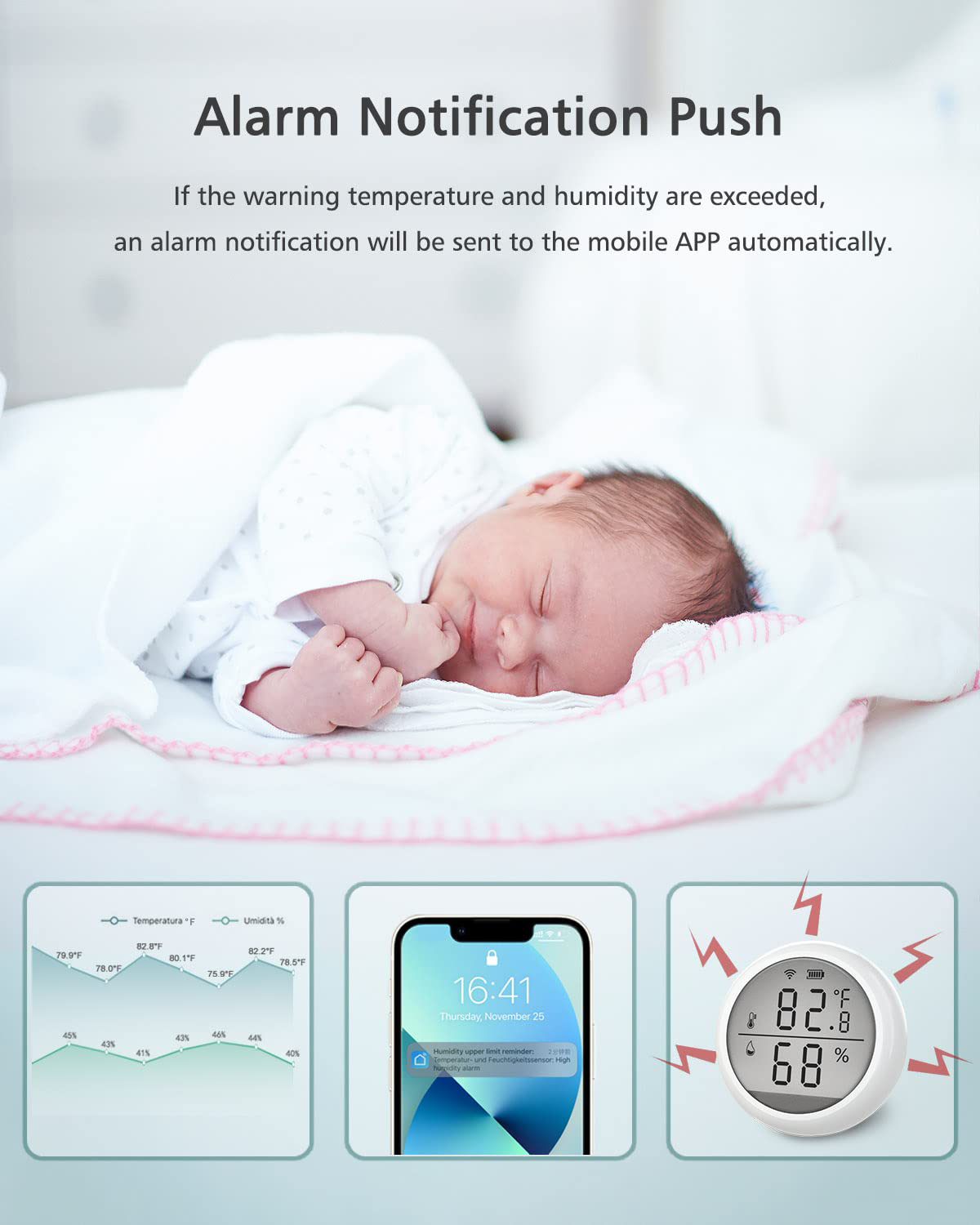 Die Temperatur kann frei zwischen Celsius und Fahrenheit geschaltet werden; Nieder- und Hochtemperaturerinnerung, intelligente Verknüpfung und die Berichtszeit von Temperatur und Feuchtigkeit können frei eingestellt werden