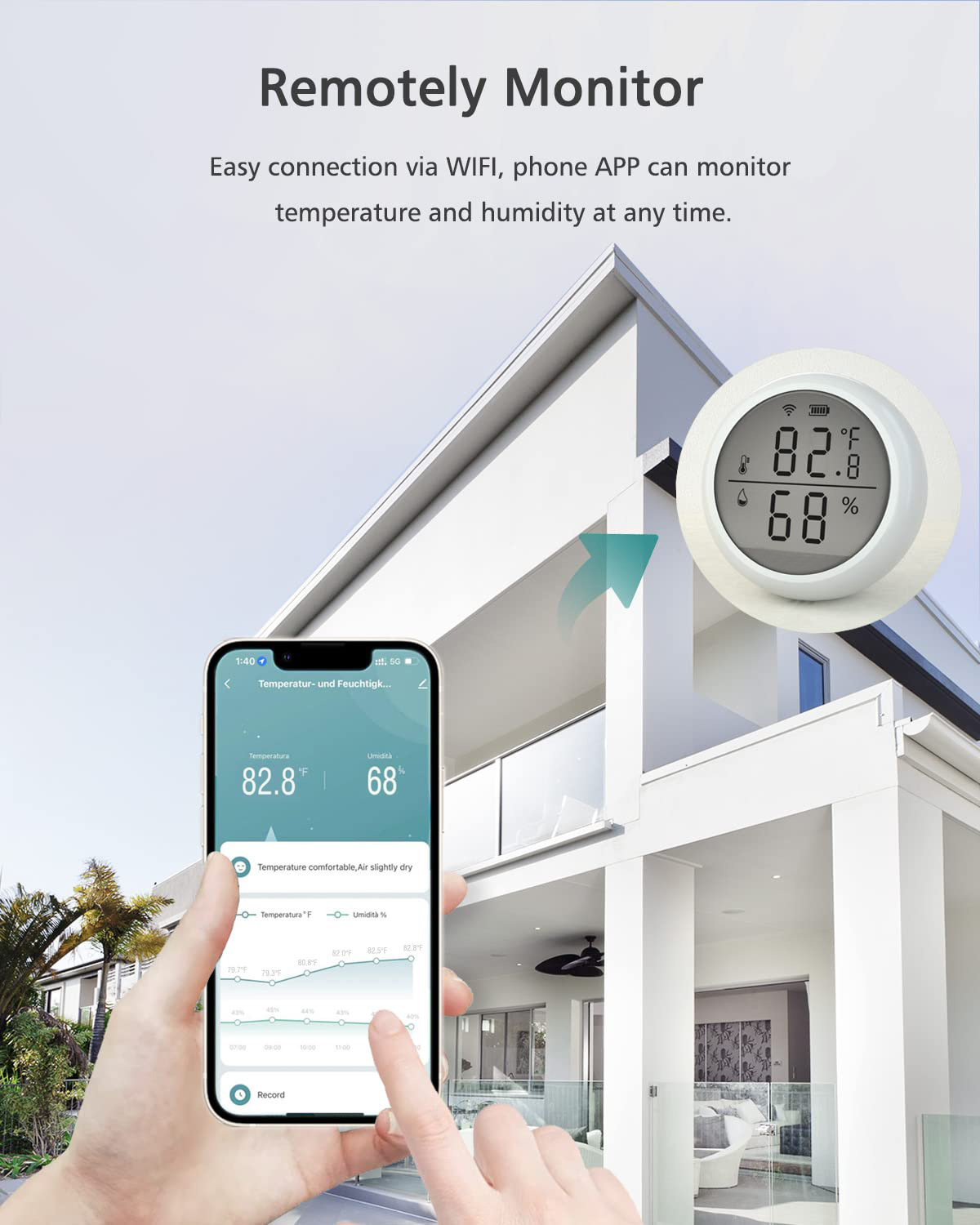 WiFi-Fernüberwachung und Anwendung: 2,4 G (5 g wird vorübergehend nicht unterstützt) WiFi ist mit Thermometer und Hygrometer verbunden, um Temperatur- und Feuchtigkeitsänderungen einfach zu überprüfen und die Berichtszeit, Celsius und Fahrenheit frei einzustellen. Es unterstützt auch die Sprachsteuerung von Alexa/Google Assistant, ohne einen Hub zu kaufen.
