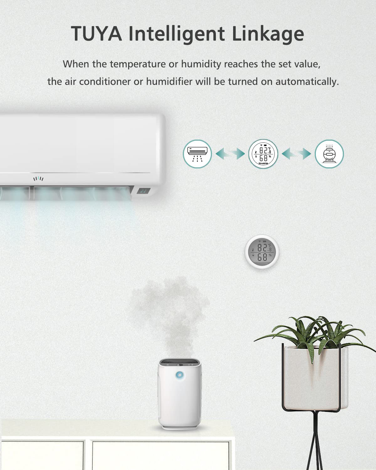 Intelligente Verbindung und Datenspeicherung: Über die Smart Life-Anwendung können Sie eine Verbindung zu Ihren anderen intelligenten Geräten wie Klimaanlagen, Luftbefeuchtern usw. herstellen. Wenn Sie die Luftfeuchtigkeit in der Anwendung anpassen, kann der Luftbefeuchter automatisch ein- oder ausgeschaltet werden. Sie können die historischen Aufzeichnungen der letzten drei Jahre überprüfen, sogar jede Stunde der letzten sieben Tage.