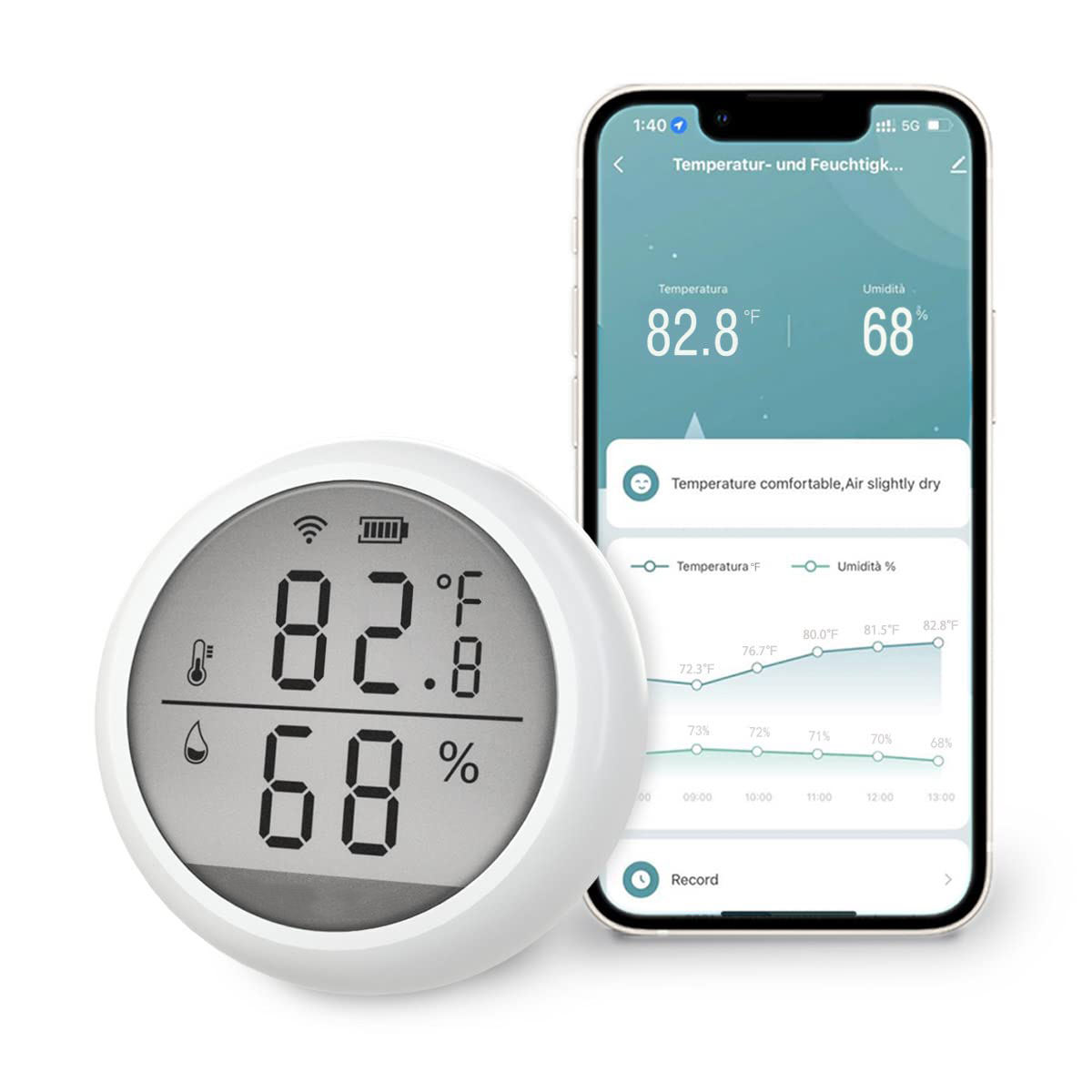 Doppelter Alarm und hochauflösendes LCD-Display: Über die Anwendung können Sie die obere Alarmgrenze festlegen. Wenn das Limit überschritten wird, gibt das Thermometer einen Alarm aus und sendet eine Benachrichtigung an Ihr Mobiltelefon. Das Display ist mit einem hochauflösenden LCD ausgestattet, das Leistung, Temperatur und Luftfeuchtigkeit schnell und klar ablesen kann.