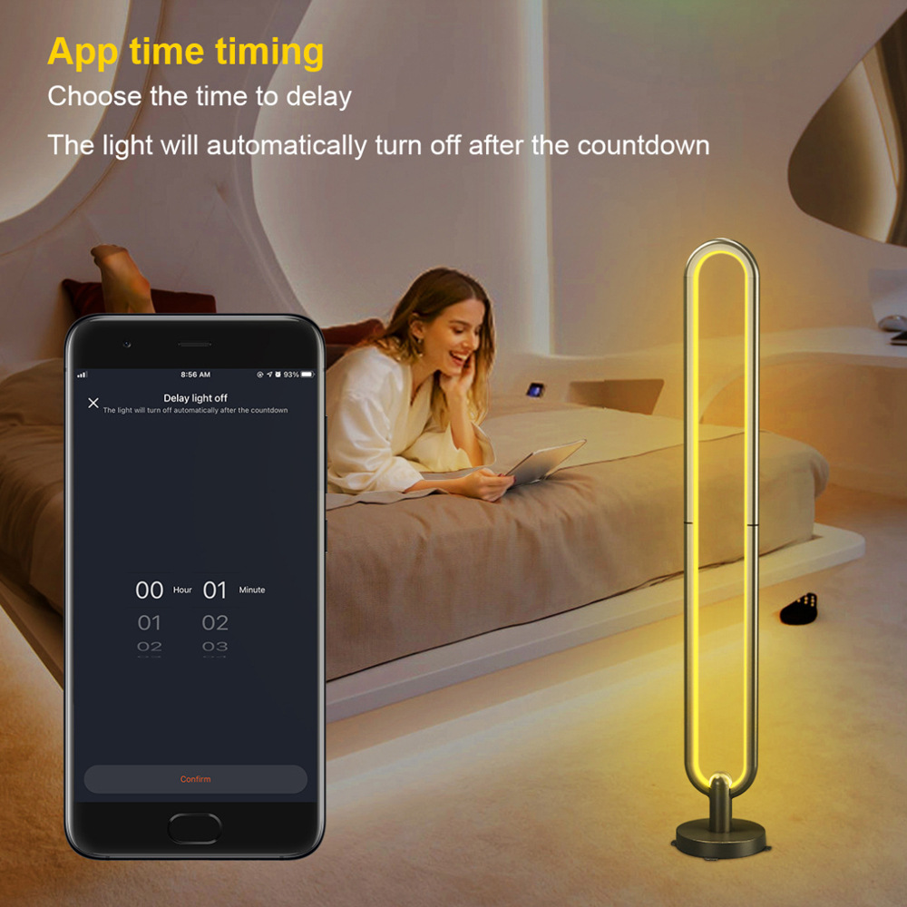 Intelligente Steuerung und Abschaltspeicher: LED-Stehlampe unterstützt Fernbedienung und Bluetooth-App-Steuerung und kann Helligkeit, Farbe, Effekt und Geschwindigkeitsparameter nach Bedarf anpassen. Die Einstellungen vor dem Stromausfall werden automatisch gespeichert, und Sie können auch geeignete Zeitplaneinstellungen für verschiedene Anlässe festlegen, um das Licht regelmäßig ein- und auszuschalten.