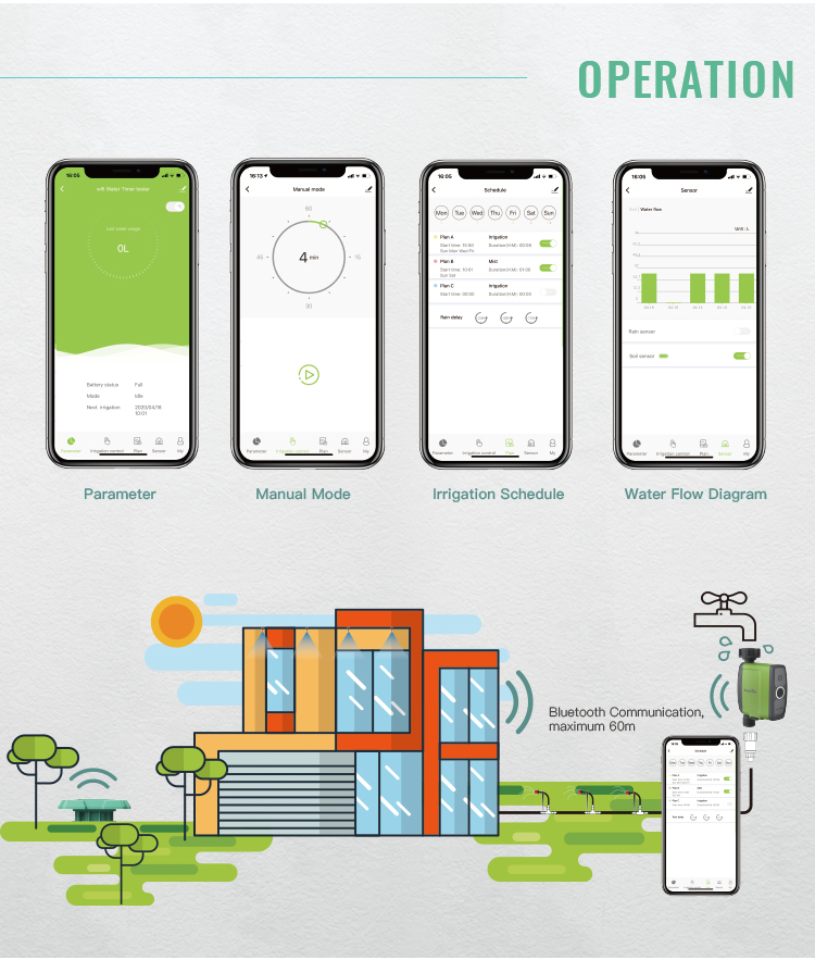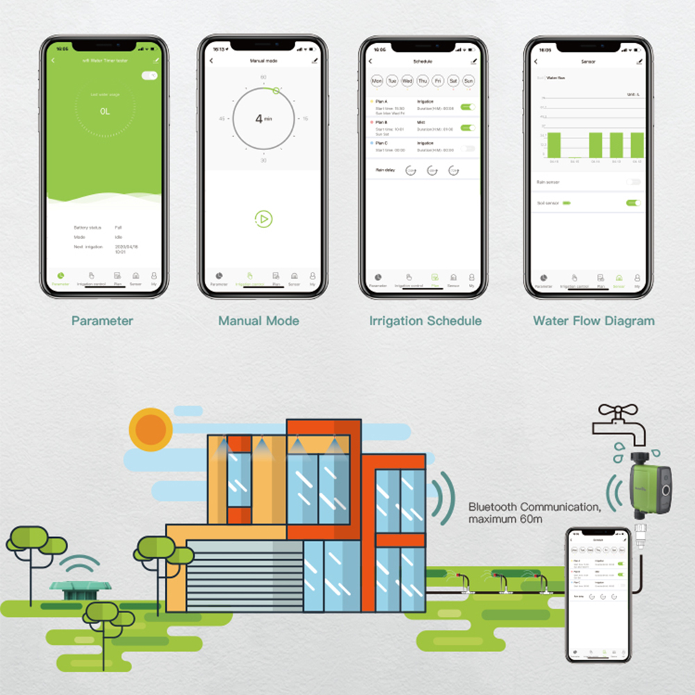 Intelligente Bewässerung: Wenn es regnet oder die Bodenfeuchte zu hoch ist, verzögert der Bluetooth-Schlauchtimer automatisch die Bewässerung um 24/48/72 Stunden und beginnt mit der Bewässerung für 1-60 Minuten, wenn die Bodenfeuchte zu niedrig ist. Sparen Sie bis zu 50% der Wasserrechnung und halten Sie Ihren Garten grün. (muss mit Bluetooth-Bodensensor übereinstimmen, um Bodenfeuchte zu erhalten, nicht enthalten)