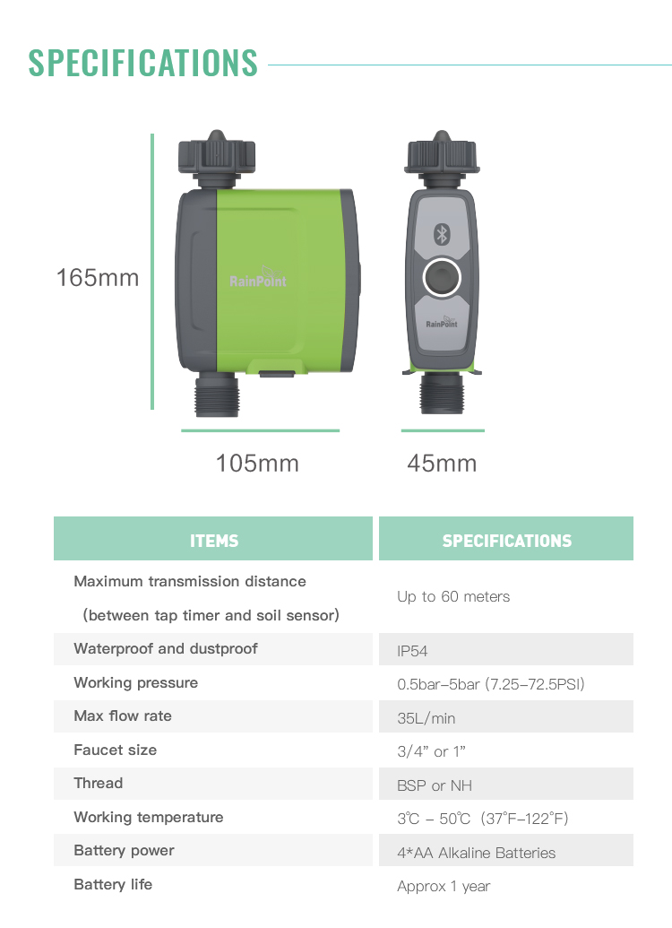 Fernbedienung Anwendung: Bluetooth automatische Sprinkler Timer schaltet Ihren intelligenten Wasserhahn ein, und Sie können ihn jederzeit und überall von Ihrem Mobiltelefon aus steuern. Die Rainpoint UI 2.0 Anwendung ist einfach und intuitiv, vereinfacht die Bewässerung und macht Ihre Reise sorgenfrei. (nur 2,4 GHz WiFi wird unterstützt)